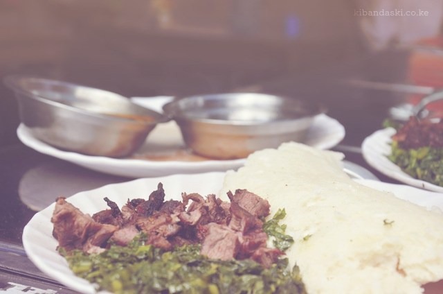 This is probably what leads you to a street nearby with a variety of informal restaurants we call kibandas. There is always a man or woman, armed with energy, beckoning you with words like “Chakula tamu hapa” or “Ni saa ya lunch”. You walk into the open shed with wood benches and take a seat beside individuals or groups who don’t look up because it is lunchtime and food, food is very important to Kenyans. There is no menu but you look at the plates around you and decide on the most tantalizing looking meal.