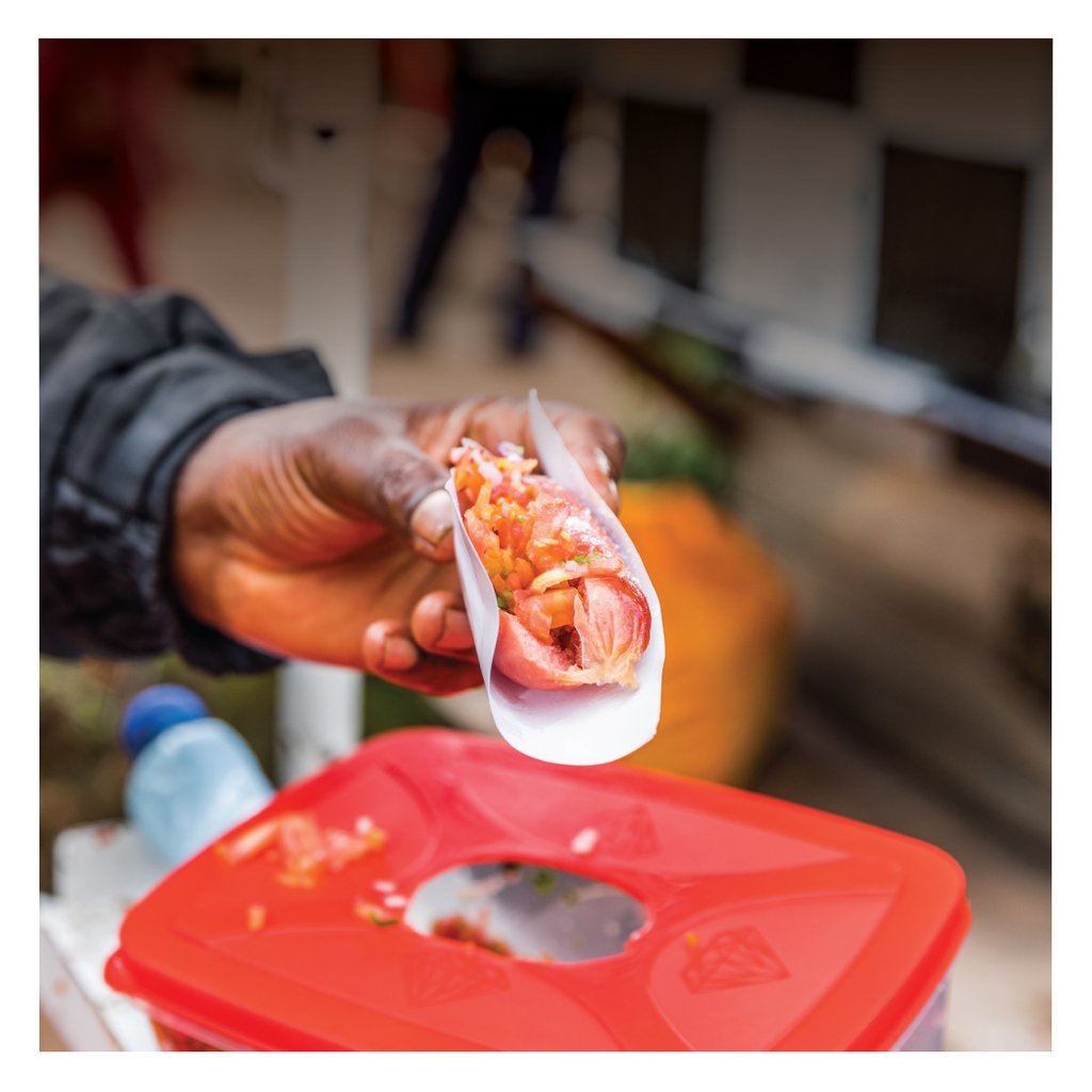 On another occasion, you are on your way to the bus stop after work. A three-wheeled white trolley is surrounded by three or four people who are gobbling little pink sausages or eggs that are on display. The vendor has two lunchboxes with a mixture of tomatoes and onions, he has a salt shaker and if you’re lucky, even a bottle of ketchup. You hear another person ask for a yai and hand the vendor a Ksh 20 coin.